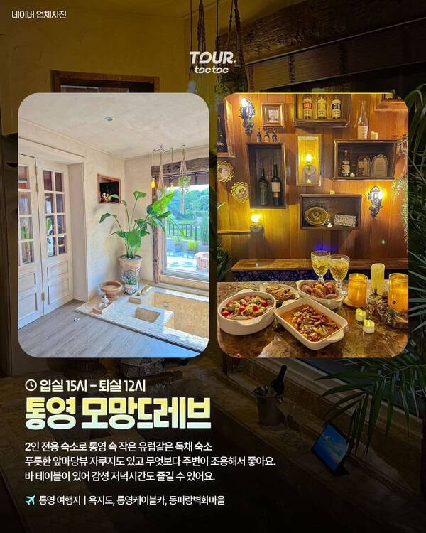 ‘통영 속 작은 유럽’같은 모망드레브는 2인 전용 감성 숙소입니다. 푸릇한 앞마당뷰 자쿠지 시설이 마련되어 있어 여유로운 시간을 만끽하기 좋은데요. 주변이 조용해 온전한 힐링을 느끼기에도 좋습니다.