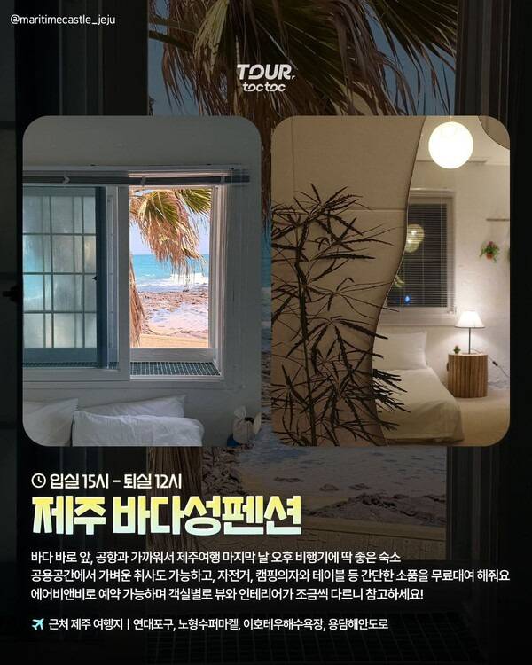 바다 앞 포구에 위치한 제주 바다성펜션은 공항과 가까이에 위치해있어 제주여행 마지막 날, 오후 비행기를 예약한 분들에게 추천하는 늦은 퇴실 숙소입니다. 에어비앤비에서 예약이 가능하며 객실별 인테리어와 베란다뷰가 조금씩 달라 예약시 취향에 따른 객실을 고를 수 있는데요.