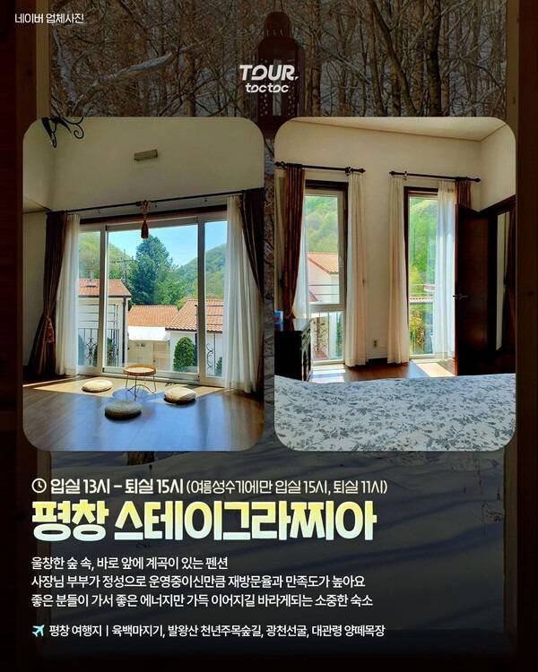울창한 숲 속, 계곡 앞에 자리안 자연 속 펜션 평창 스테이그라찌아입니다. 평소에는 오후 1시 입실, 오후 3시 퇴실로 무려 26시간동안 펜션에 머무를 수 있는 곳인데요. 여름 성수기에 한하여 오후 3시 입실, 오전 11시 퇴실로 운영되니 예약 시 참고하시길 바랍니다.