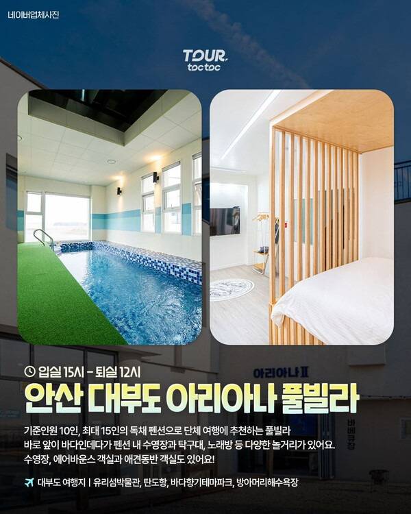 바다 바로 앞에 위치한 대형 풀빌라, 안산 대부도의 아리아나풀빌라입니다. 총 3개의 객실로 이루어져있으며 모두 기준인원이 10인, 최대인원 15인으로 단체 여행이나 워크샵 등에 추천하는 늦은 퇴실 펜션입니다.