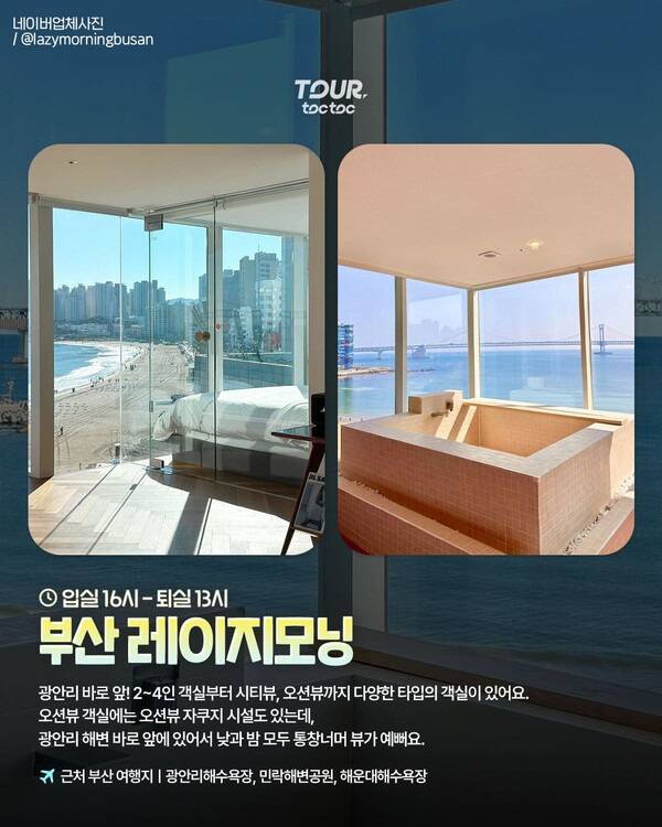 광안리 해변 바로 앞에 위치해있어 통창을 통해 광안대교가 반짝이는 낮과 밤 풍경이 아름다운 곳이기도 합니다. 오션뷰 객실에는 통창 바로 앞, 자쿠지가 마련되어 있어 부산 여행시 노곤한 피로를 풀기에도 좋습니다.