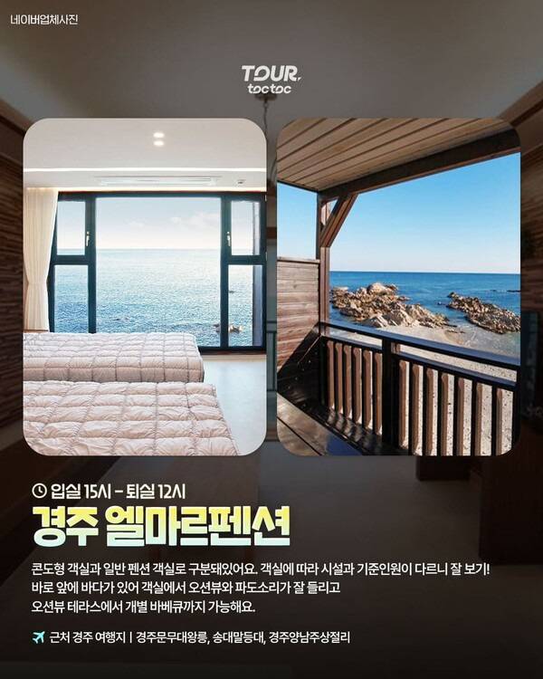 경주 감포 바다를 마주하고 있는 엘마르펜션은 콘도형 객실과 일반 펜션형 객실을 함께 운영하고 있습니다.객실에 따라 구조와 기준인원이 조금씩 다르지만, 대부분의 객실에 오션뷰 테라스가 마련되어 있어 맑고 깨끗한 바다와 파도 소리를 발 밑으로 감상할 수 있습니다.