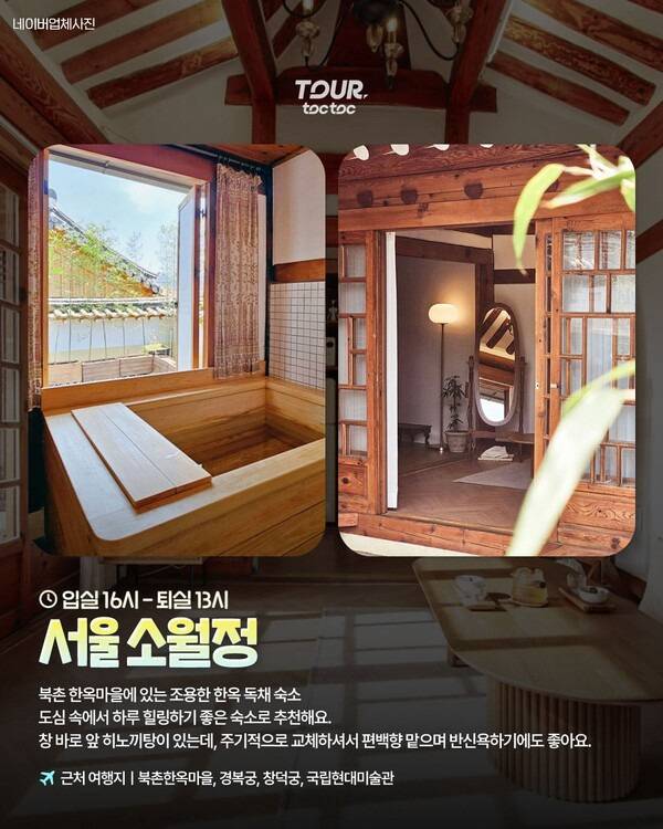 서울 도심 한복판, 북촌 한옥마을 안에서 조용히 하루동안 힐링하기 좋은 독채형 한옥스테이 소월정입니다. 도심임에도 조용한 북촌한옥마을에 위치해있으며, 편백향이 가득한 히노끼탕이 창가 바로 앞에 놓여있어 여유로운 반식욕을 즐기기에도 좋은 곳이죠.