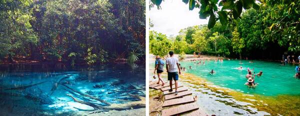 블루풀에서 약 10분 정도 내려오면 에메랄드 풀을 만날 수 있는데요. 이곳은 블루풀과 다르게 물속에 들어갈 수 있는 천연수영장인데, 이곳도 물의 색이 마치 옥색을 띠는 듯한 광경이 들고 매우 아름다워 추천드리는 명소입니다.