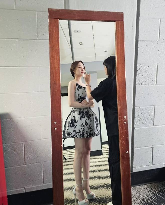또, 박민영은 심플한 실버 액세서리를 활용해 화려하고 세련된 느낌을 더했습니다.