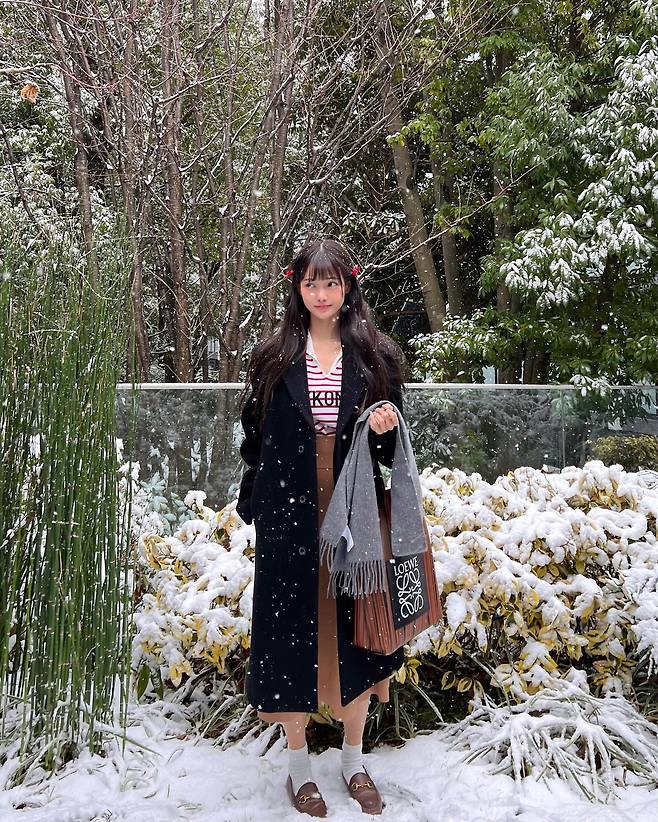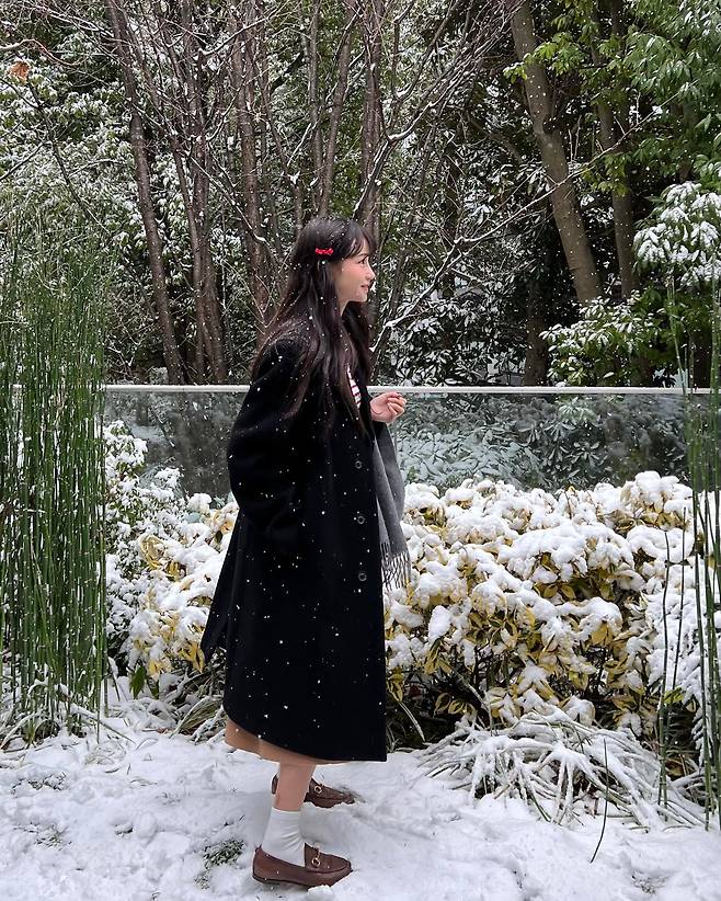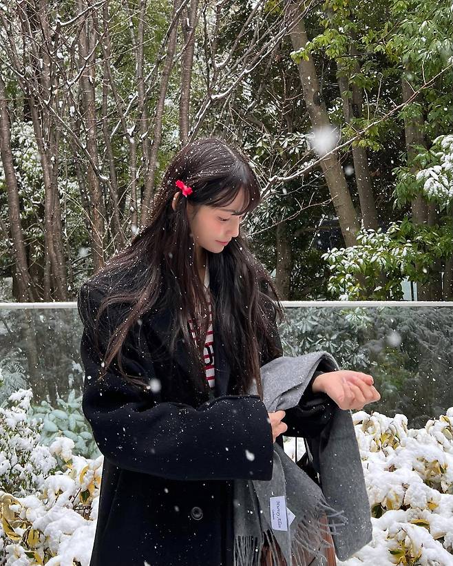 짙은 컬러는 흰 눈과 대비되어 그녀의 깨끗한 피부 톤을 더욱 돋보이게 했고, 롱 헤어에 윤기가 흐르도록 연출해 건강한 이미지를 더했어요.