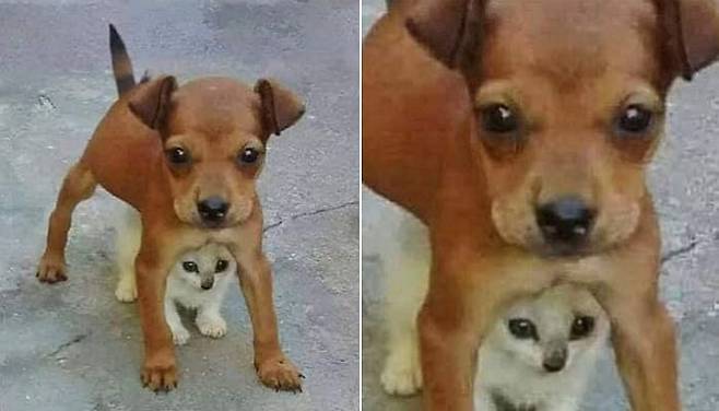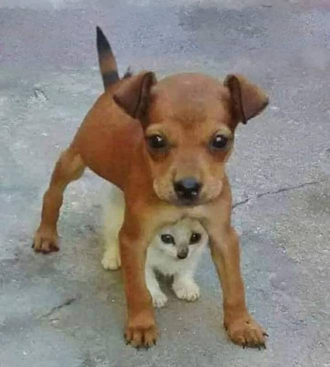 작은 강아지가 고양이를 지키겠다고 서있는게 아니겠어요 ㅎㅎ