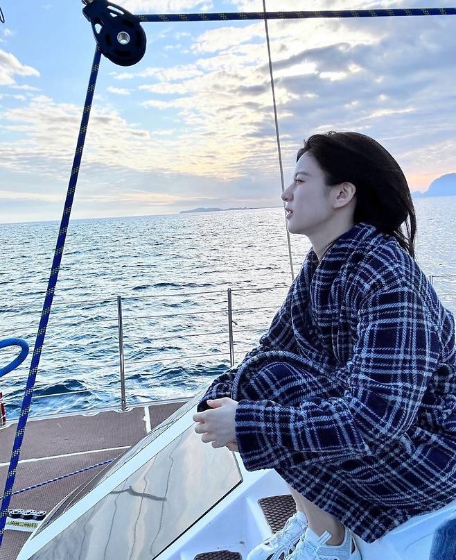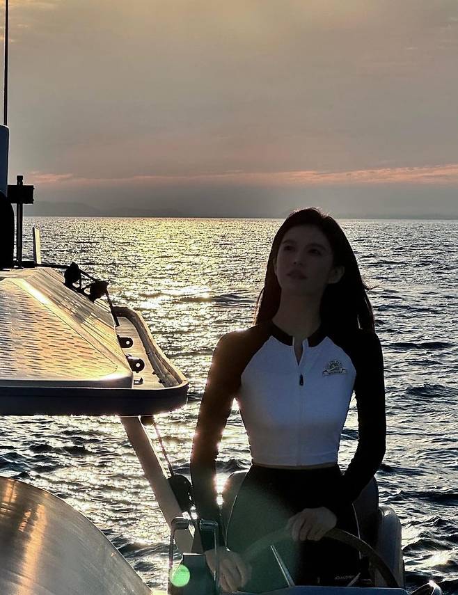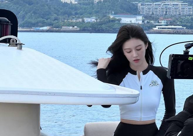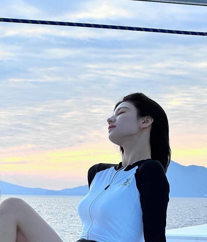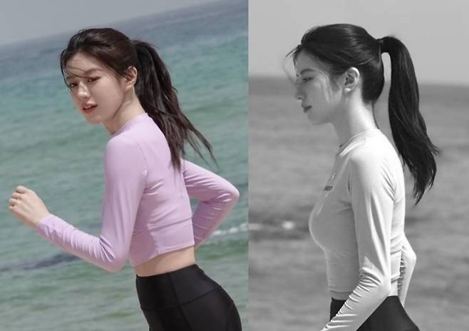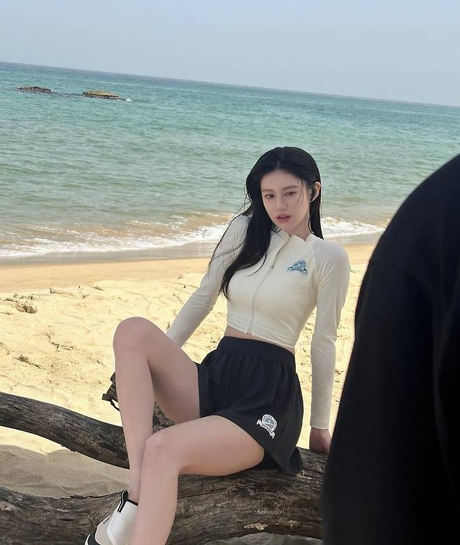 고윤정은 긴 머리카락을 높게 묶어 자연스럽고 편안한 느낌을 주는 바닷가 바캉스 스타일을 제시했습니다.