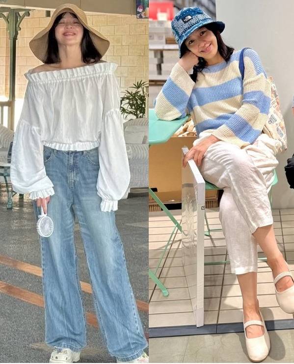 오프숄더 스타일의 벌룬 슬리브 블라우스를 착용해 여성스러운 실루엣을 강조했으며, 라이트 한 워싱의 와이드 데님 팬츠로 편안한 캐주얼 감성을 더했습니다.