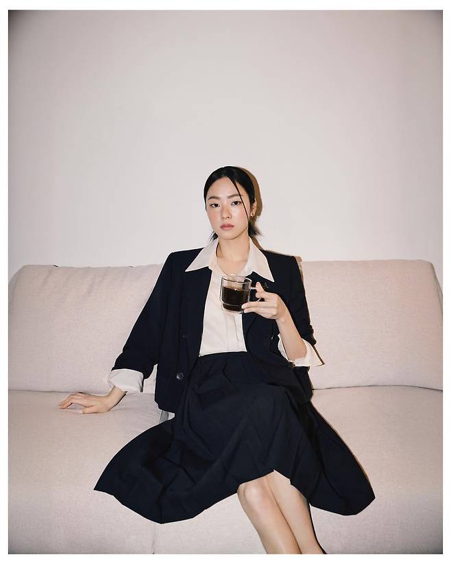 전여빈이 베이지 소파에 앉아 블랙 수트 룩을 선보이고 있다. 화이트 셔츠와 블랙 재킷, 플리츠 스커트로 구성된 클래식한 조합으로 단정하면서도 모던한 분위기를 연출하고 있다. 한 손에 든 머그컵과 함께 여유로운 일상의 순간을 포착한 이 룩은 오피스 웨어의 정석을 보여준다.