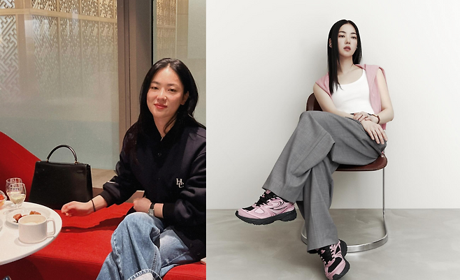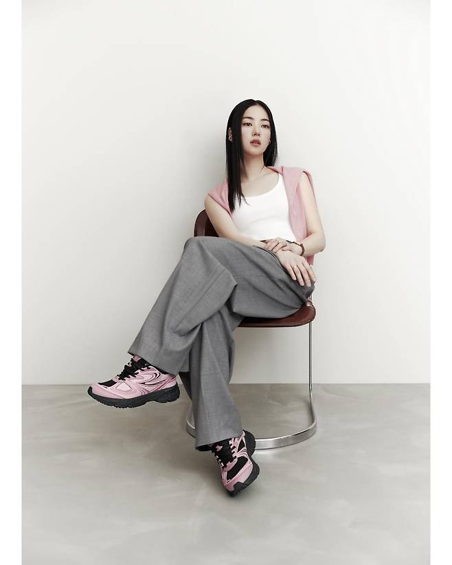그레이 와이드 팬츠에 화이트 탱크톱, 핑크 가디건을 레이어드한 전여빈의 모습이다. 특히 핑크 컬러의 스니커즈로 포인트를 주어 스포티하면서도 페미닌한 매력을 동시에 연출하고 있다. 모던한 의자에 앉은 포즈로 젊은 감성의 스타일을 완벽하게 소화해내고 있다.