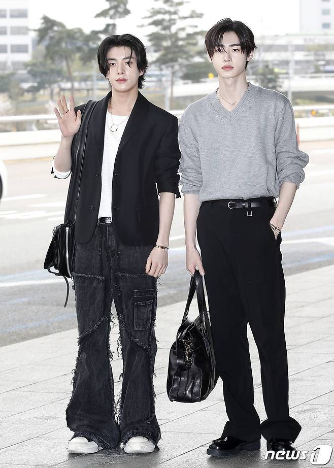 (김포공항=뉴스1) 권현진 기자 = 엔하이픈 제이크와 성훈(오른쪽)이 해외 일정을 위해 8일 김포국제공항에 도착해 인사를 하고 있다. 2024.4.8/뉴스1