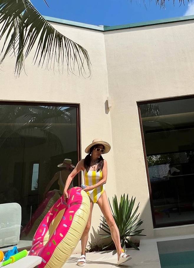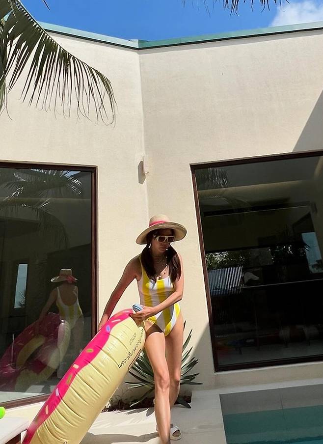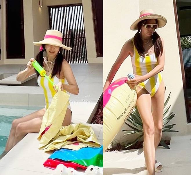 공개한 사진에서 황신혜는 생기발랄한 옐로 스트라이프 원피스 수영복에 핑크 띠가 멋스러운 파나마햇의 리조트룩으로 감각적인 수영장 리조트룩을 선보였다.