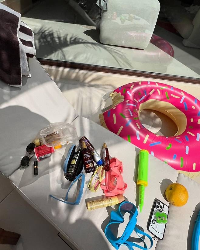 황신혜는 15일 자신의 채널에 “pool day, 우연한 색감 매칭, 핑크, 옐로”라는 글과 함께 제주 여행 사진을 게재했다.