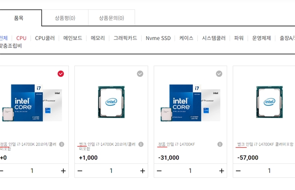 제품에 따라 차이는 있지만 기사 작성 시점은 7월 하순 가격 비교 사이트 최저가 기준, 인텔 14세대 코어 CPU는 정품 CPU가 벌크 CPU보다 최대 6만원 가까이 비싼 상황이다. 이정도의 차이를 보이는 모델은 전체 제품 중 1, 2종에 불과하고 보통은 1~2만원 정도 차이지만, 지갑을 열기 망설여지는 상황에서 무시하기 어려운 차이다.