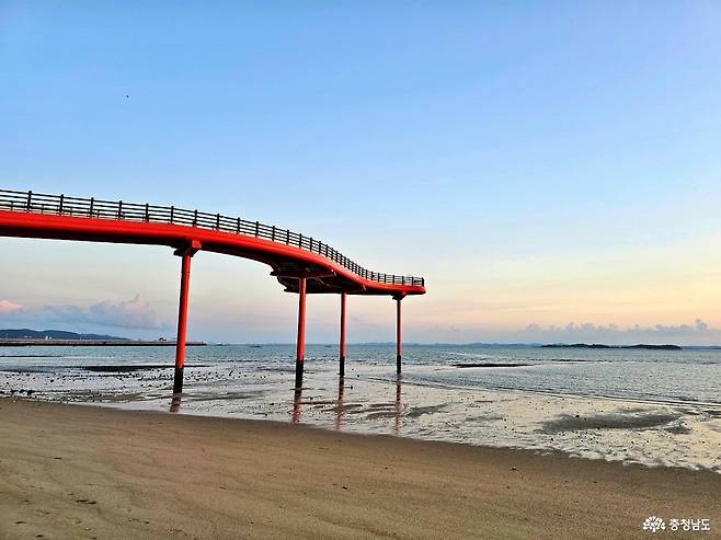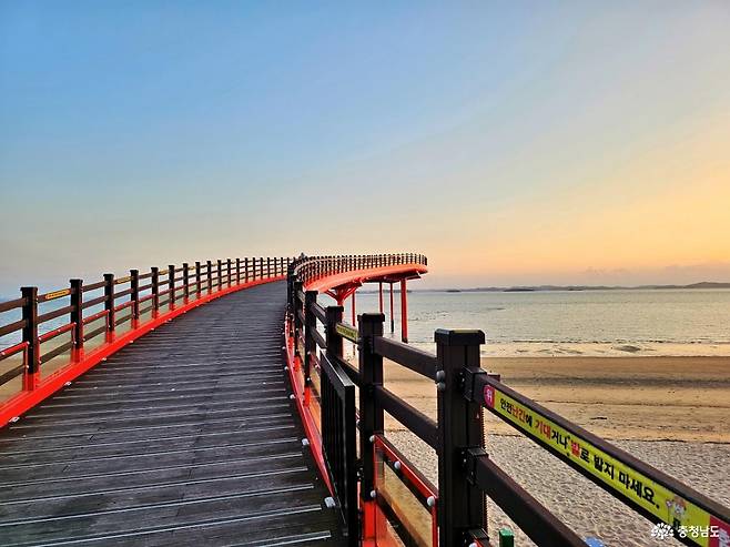남당항에서 어사리 노을공원으로 이어지는 길목에 자리한 이곳은, 이름 그대로 노을을 가장 가까이서 품을 수 있도록 설계된 특별한 공간입니다. 바다를 향해 길게 뻗은 붉은 길 위에서 맞이하는 1월의 해넘이, 함께 감상해 보실까요?