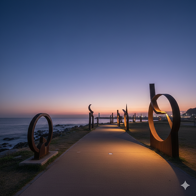 전망대 구경을 마쳤다면 인근의 어사리 노을공원까지 이어지는 해안 산책로를 걸어보세요. 조각 작품들과 어우러진 해안길은 또 다른 낭만을 선사합니다. 1월의 찬 바람이 상쾌하게 느껴질 만큼 정비가 잘 되어 있어, 가벼운 산책만으로도 일상의 스트레스를 씻어내기 충분합니다.