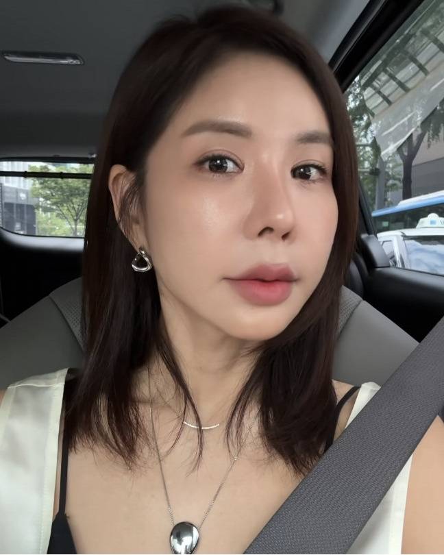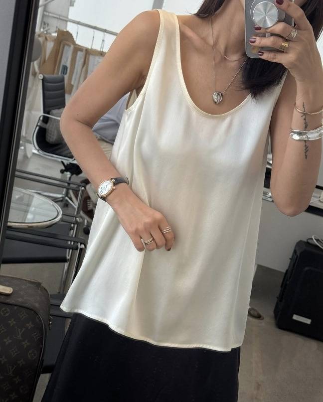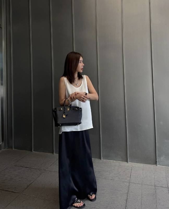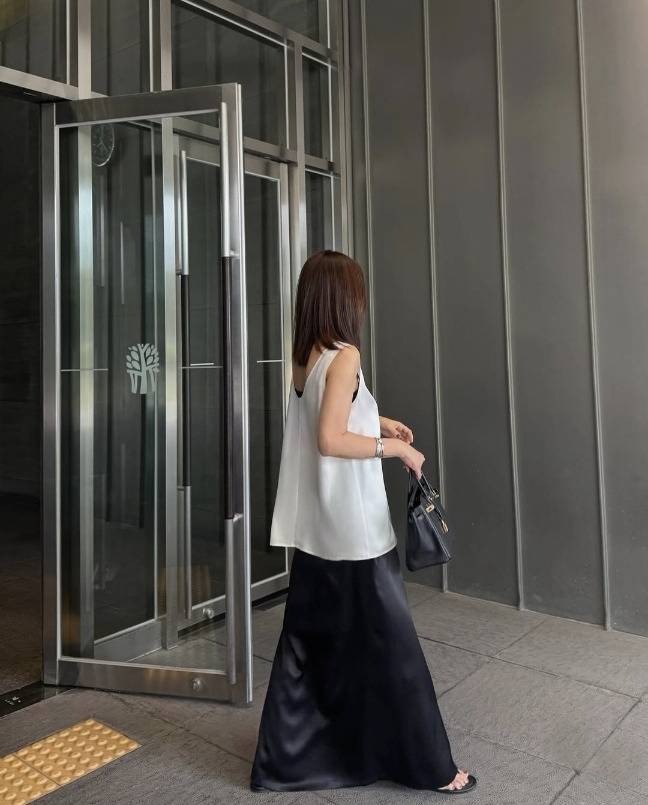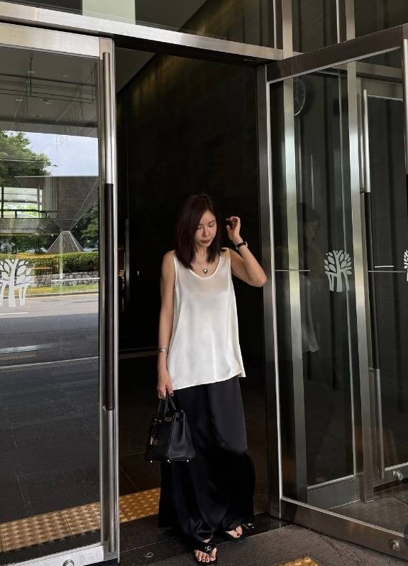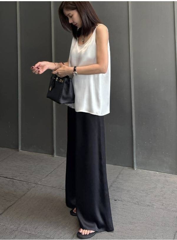 김준희는 은은한 광택의 새틴 슬리브리스 톱과 블랙 와이드 팬츠를 매치해 모노톤의 세련된 여름룩을 완성했습니다.