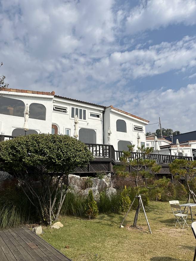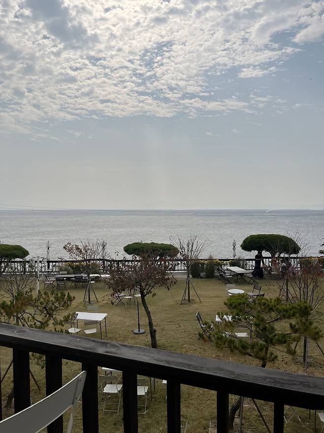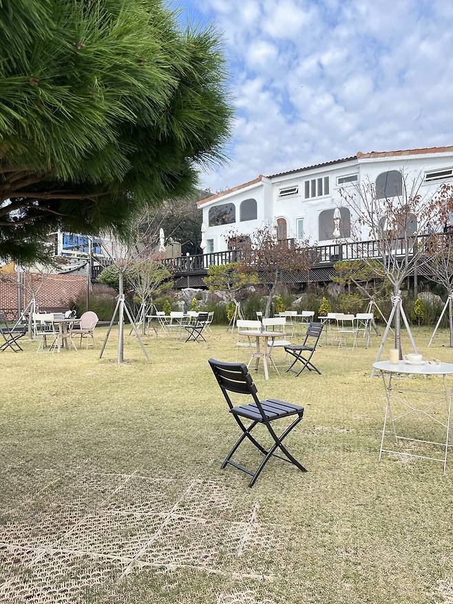 카페에 들어서면, 건물 앞뒤로 펼쳐진 넓은 야외 정원이 가장 먼저 눈길을 사로잡아요. 잔디밭과 자연스러운 조경이 어우러져, 편안히 걸으며 사진을 찍거나 벤치에 앉아 잠시 쉬기에도 좋죠. 시원한 바닷바람을 맞으며 잔디에 앉아 음료를 마시는 시간은, 평소 도심에서 누릴 수 없는 호사이기도 해요.