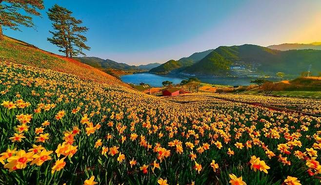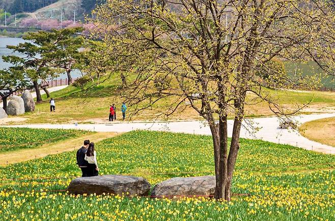 특히 3~4월이 되면 언덕 가득 수선화가 피어난다. 노란 꽃이 초지와 어우러지며 한층 더 화사한 장면을 만든다. 언덕 위에서 저수지와 수선화를 함께 내려다보는 순간은 많은 사람들이 카메라를 들게 되는 포인트다.