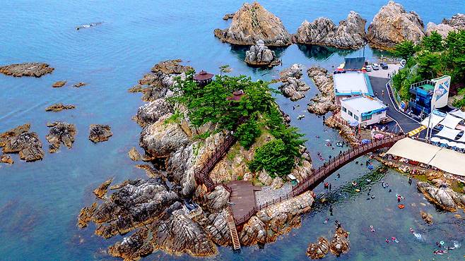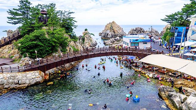특히 둔대암과 구름다리 아래 형성된 천연 해수 풀장은 아이들에게 최고의 놀이터가 됩니다. 갯바위가 방파제 역할을 하며 큰 파도를 막아주기 때문에 물결은 잔잔하고 수심도 얕아 안전한 물놀이가 가능합니다.