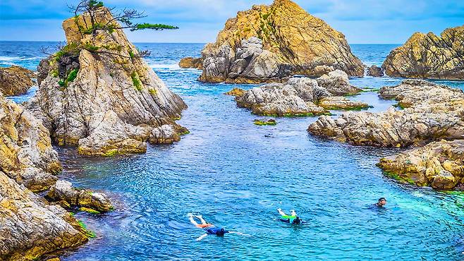 맑고 깊은 바다 위로 햇살이 부서지고, 곳곳에 솟아오른 기암괴석들은 장호항만의 독특한 풍경을 완성합니다. 자연이 만들어낸 고요함과 절제된 아름다움은 보는 것만으로도 마음을 편안하게 만들어 주죠.