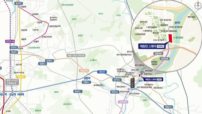 또한 광주초·중·중앙고 등이 가까이 있어 교육 여건이 우수하며 도보권 내 참조은병원, 이마트(경기광주점), CGV 등 쇼핑·의료·문화시설이 밀집해 있다. 경강선 경기광주역과 가까워 판교까지 14분, 강남권까지도 40분대로 진입할 수 있는 교통 여건을 갖췄다.
