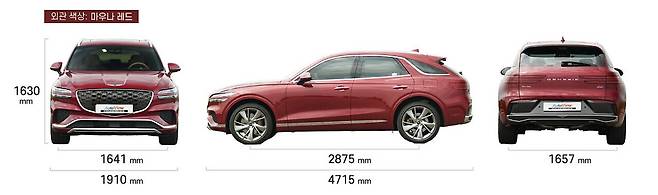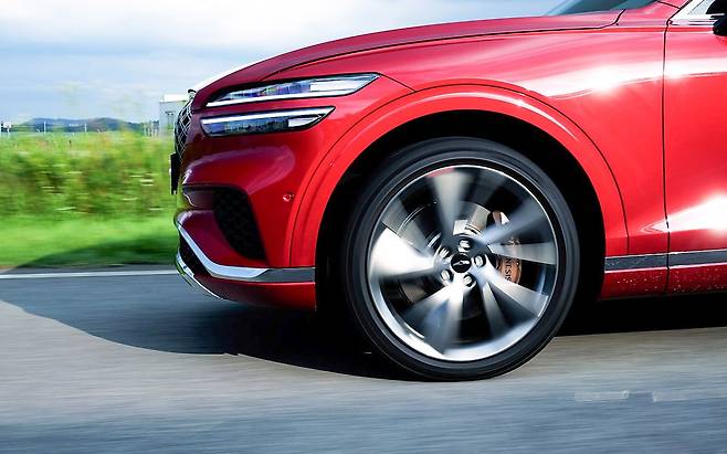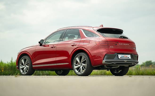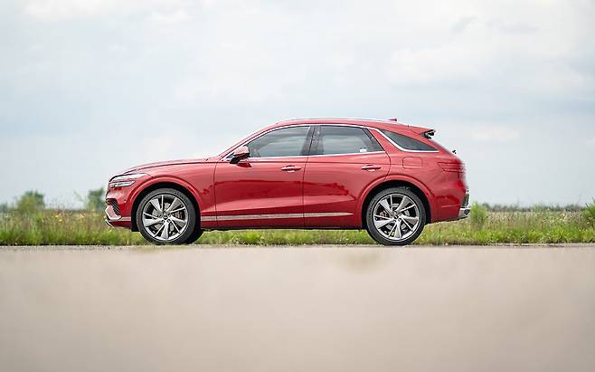 측면에서 바라본 GV70은 좋은 비율을 가졌다. 긴 후드를 비롯해 깔끔하게 차량 후미까지 떨어지는 라인에서 상급 모델인 GV80 보다 높은 디자인 완성도를 자랑한다. 캐릭터 라인은 전진감도 우아함도 더한다. 21인치 다크 스퍼터링 휠이 휠 아치를 채웠는데 코퍼 도장의 모노블럭 캘리퍼의 조합이 고급스러운 느낌도 보여준다.