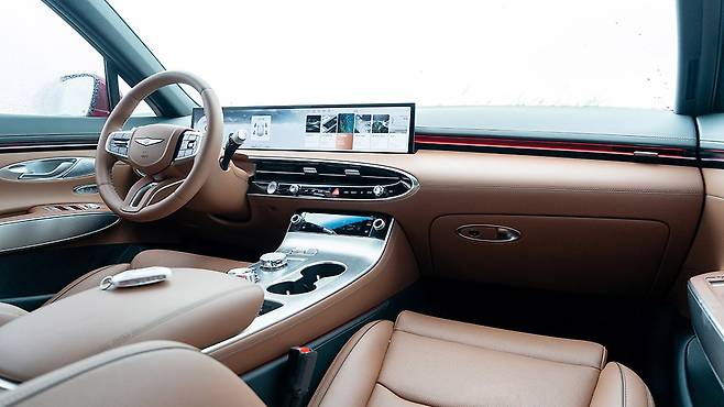 테스트카의 실내는 오션웨이브 블루와 하비나 브라운 투톤 가죽으로 꾸며졌다. 눈에 띄는 대부분의 영역을 브라운 가죽으로 덮었는데, 70년대 유럽의 풍요를 상징했던 럭셔리 모델들의 실내가 이와 흡사한 디자인 패턴으로 제작됐었다. 제네시스도 나름대로 클래식한 멋을 담으려 노력한 것.