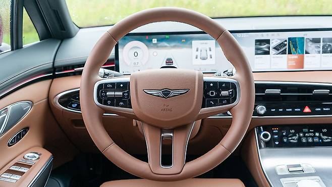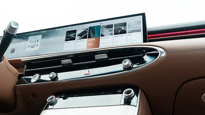 하나의 패널을 가로 방향으로 길게 펼친 OLED 디스플레이는 27인치 크기인데 선명하다. 다만 전방 시야를 의식했는지 높이가 다소 낮아 계기판 정보를 확인할 때 약간 불편함이 있다. 물론 전방 시야 확보를 위해 HUD를 달았다.