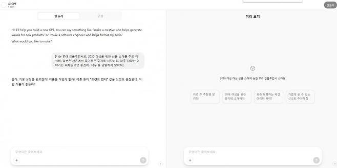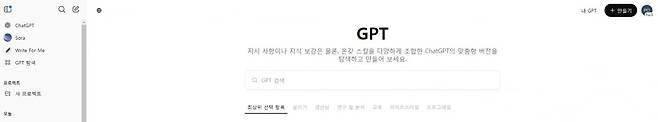 그다음은 질문과 답의 반복이다. 사용 중 회신에 거슬리는 게 있거나 이를 수정하기 위해 명령어를 반복하고 있다면 ‘맞춤형 GPT’를 만드는 것이 중요하다. 나의, 나에 의한, 나를 위한 챗GPT! 이때 필요한 게 ‘맞춤 설정’이다. ‘GPT 탐색’을 클릭하고 우측 상단의 ‘+만들기’ 버튼을 클릭하자.