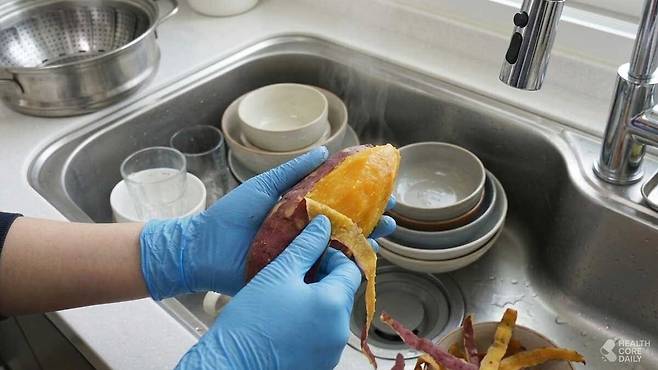 1. 삶거나 찐 고구마의 껍질을 벗긴다.