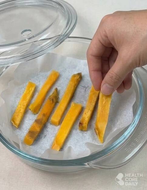 접시에 고구마를 펼쳐 놓은 뒤 전자레인지에 넣고 약 2분 정도 가열한다. 처음부터 오래 돌리기보다는 짧은 시간을 여러 번 나눠 가열하는 방식이 좋다. 가열이 끝나면 접시를 꺼내 고구마를 하나씩 뒤집어 준다. 이렇게 하면 양쪽 면에서 수분이 균일하게 빠진다.