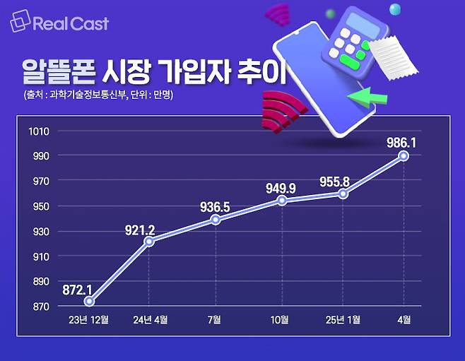 금융권 경쟁이 이어지고 있는 알뜰폰 시장 가입자는 4월 말 기준 986만 명을 넘어서며 증가추세가 이어지는 것으로 확인됐습니다. 지난해 12월 알뜰폰 시장 가입자가 소폭 줄어든 이후 올해 들어 매달 10만 명 이상 꾸준히 증가하고 있어 하반기 중 1000만 명을 돌파할 것으로 예상됩니다.