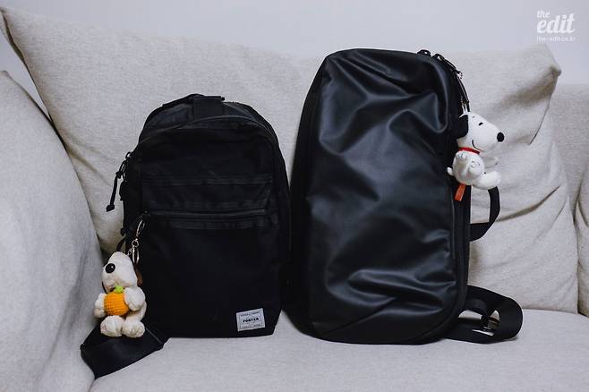 아이패드를 챙길 때 쓴 가방(왼쪽)과 노트북을 챙길 때 쓸 수 있는 가장 작은 가방(오른쪽). 그마저 오른쪽 가방은 노트북과 충전기를 넣으면 다른 물건들을 넣는 것은 거의 포기해야 합니다.