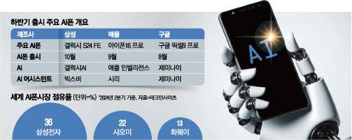 AI폰은 생성형AI 기반 기능들을 사용할 수 있는 성능을 가진 스마트폰을 뜻한다. 올해 2분기 기준 세계 AI 폰 시장 점유율은 36%로 삼성전자가 1위를 차지했다. 중국 샤오미는 22% 점유율로 2위, 화웨이는 13% 점유율로 3위를 기록했지만 구글 픽셀9과 아이폰16이 등장하면 큰 지각변동이 있을 것으로 예상된다.