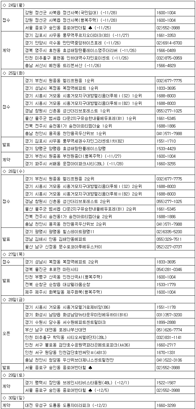 22일 부동산R114에 따르면 11월 마지막 주에는 전국 9개 단지에서 총 2천802가구(일반분양 2천34가구)가 분양을 시작한다.