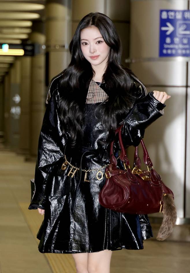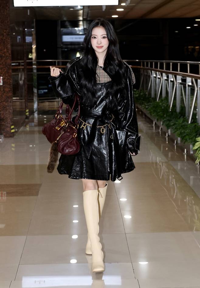 그룹 미야오(MEOVV)의 멤버 안나가 올 블랙 코팅 트렌치코트룩으로 공항 시선을 올킬했다.
