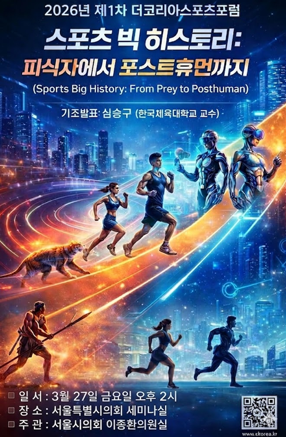 더코리아스포츠포럼은 오는 27일 오후 2시 서울특별시의회 세미나실에서 제26-1차 포럼을 개최한다고 밝혔다. 이번 포럼의 주제는 ‘스포츠 빅 히스토리: 피식자에서 포스트휴먼까지(Sports Big History: From Prey to Posthuman)’다.