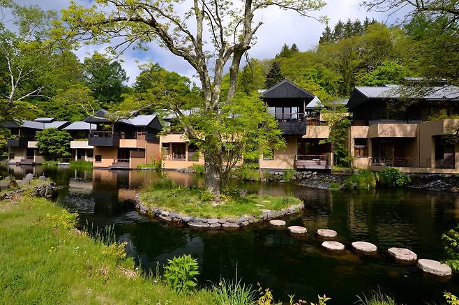 일본 대표 럭셔리 리조트, 호시노야 가루이자와는 ‘객실 자체가 하나의 마을’이라는 특별한 콘셉트로 설계되었습니다. 얕은 연못 위에 전통 료칸 스타일의 객실들이 떠 있는 듯한 독특한 풍경은, 보는 것만으로도 마음을 사로잡는데요.
