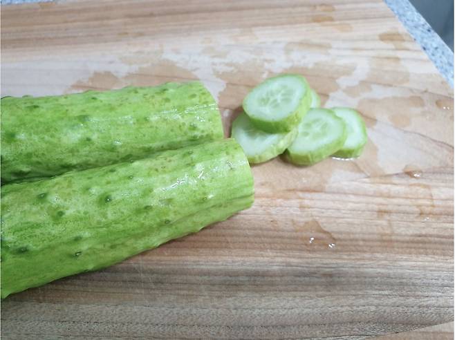 씁쓸한 맛이 나는 꼭지는 제거해 주고 먹기 좋은 크기로 오이를 썰어주세요