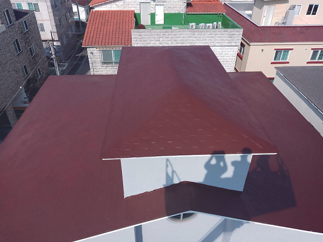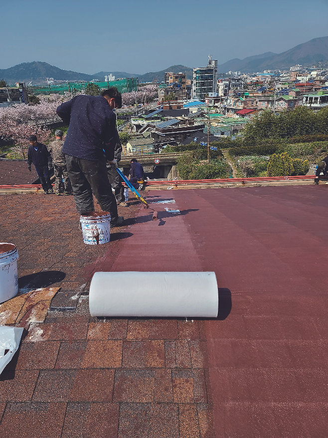 한편, 누수가 발생하고 있다면 2가지 방법으로 시공할 수 있다. 첫 번째로 누수 발생량이 적고 슁글이 떨어진 부분이 없다면, 점성이 있는 투명한 색상(기존 슁글의 색상은 유지)이나 적밤색 계열의 방수제를 2~3회 도포하면 된다. 두 번째는 슁글이 떨어지고 오래돼 낡은 경우, 시공하는 방법이다. 기존 슁글을 철거해 방수하고 슁글을 재시공하면 번거로움과 비용의 부담이 가중될 수 있다. 이러한 상황에서는 섬유형 시트인 보강포와 적밤색 방수제를 같이 시공하면 기존의 지붕 위에 질긴 고무 시트가 만들어져서 방수가 되고 새로운 지붕이 만들어지며 단열 효과까지 얻을 수 있다.