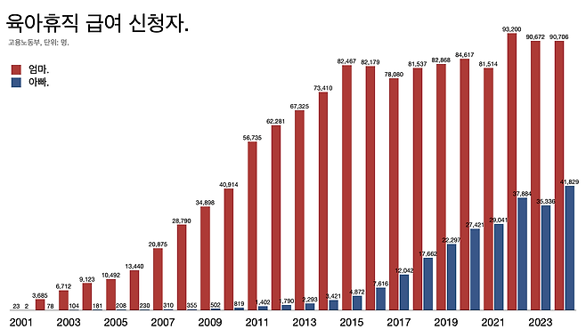- 그나마 지난해 육아휴직 급여가 확대되면서 늘어난 게 이 정도다. 부모 모두 자녀 생후 18개월 안에 6개월 휴직을 쓰면 월 최대 450만 원까지 급여를 받을 수 있다.