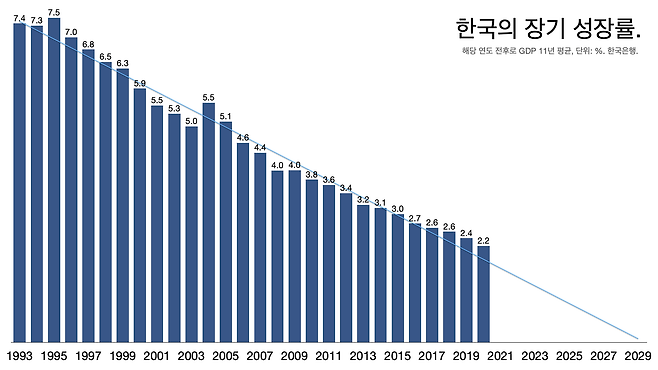 - 김세직(서울대 교수)의 ‘5년 1% 하락 법칙’에 따르면 한국의 장기 성장률은 올해 0%대에 진입한 뒤 2029년이면 0.1%까지 추락한다.