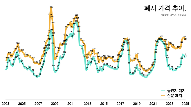- 골판지 폐지는 193원까지 갔다가 올해 1월 기준으로 105원 수준이다.