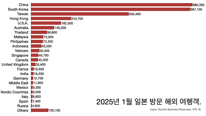 - 지난달 97만7100명의 한국인이 일본을 다녀왔다. 지난해 같은 기간 대비 13% 늘었다.