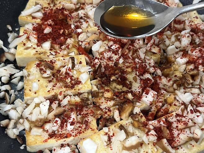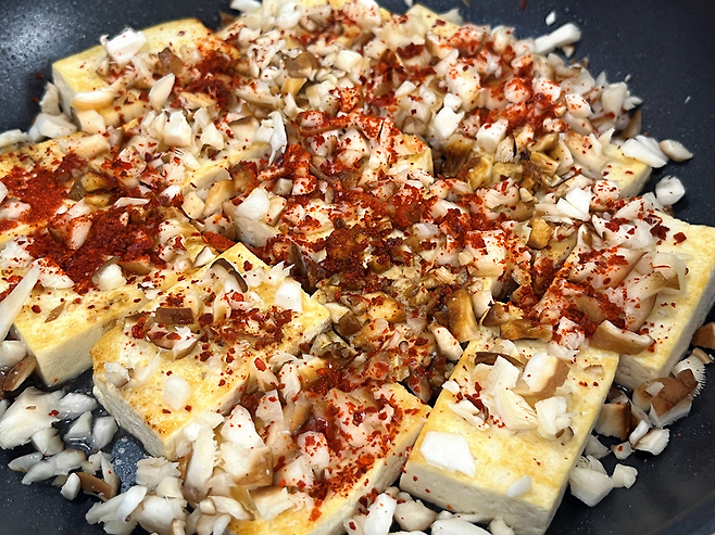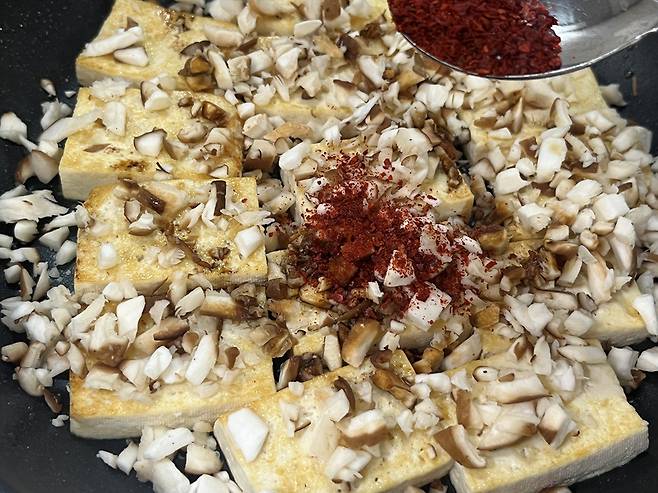 고춧가루 1스푼을 두부 위에 골고루 뿌려 주세요. 조금 더 칼칼하고 매콤하게 드시고 싶은 분들은 고추장 반 스푼 정도 추가해도 좋습니다.