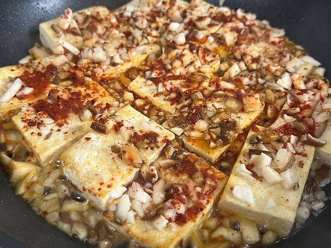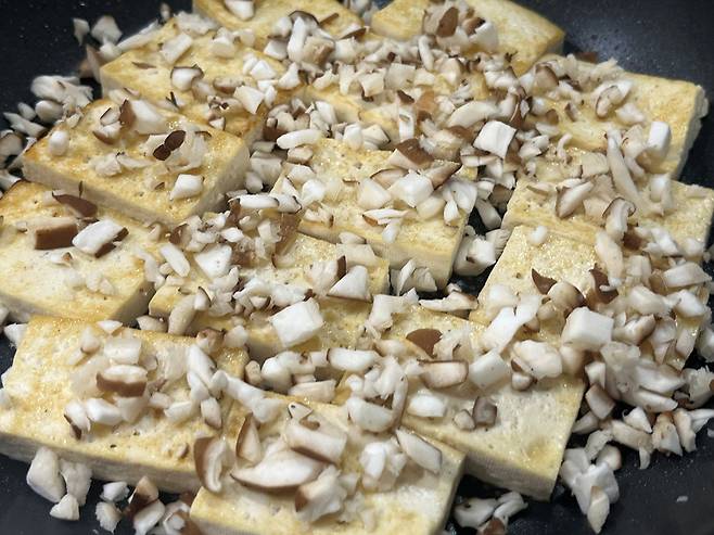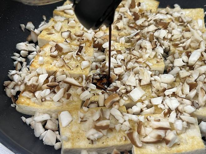 구워진 두부 위에 표고버섯을 고르게 올려 줍니다. 버섯의 풍미가 조림 양념과 어우러져, 밋밋하던 두부가 고기반찬처럼 진한 맛으로 변하게 됩니다. 두부의 밋밋한 맛을 별로 안 좋아했던 사람이라도 이렇게 표고버섯 추가하여 만들면 감칠맛이 확 살아나 맛있게 먹을 수 있습니다.