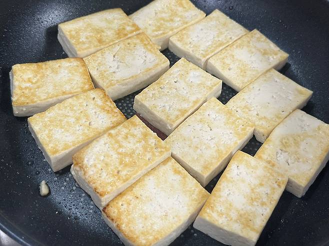 두부는 한 입 크기로 잘라 물기를 제거한 다음 팬에 중불로 굽습니다. 이때 키친타월로 수분을 충분히 닦아내야 기름이 튀지 않고 겉이 노릇하게 구워집니다.