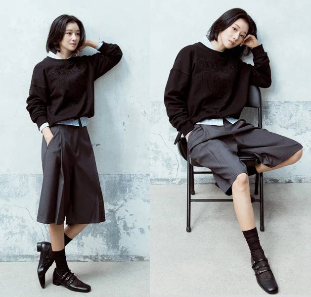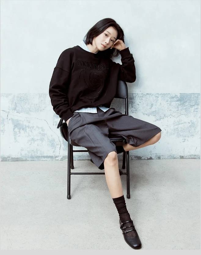 블랙 스웻셔츠에 셔츠를 레이어드하고, 무릎 아래로 내려오는 그레이 컬러의 버뮤다팬츠를 매치해 깔끔하면서도 중성적인 매력을 완성했습니다.